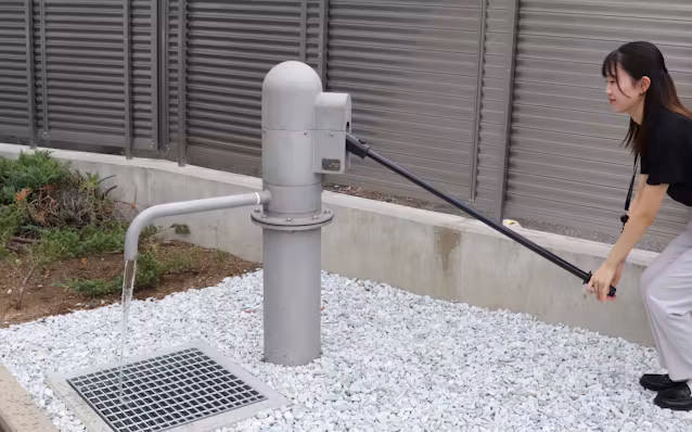 井戸のポンプは力の弱い人でも操作しやすいのが特徴。1日当たり2万1600リットル(93人分)の生活用水を確保できる。日さくによると、2024年1月の能登半島地震などを機に、埼玉県内でも防災井戸を設置する動きが広がっているという。