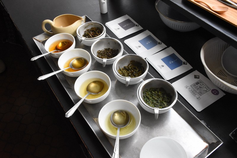 拝見場は製茶問屋独特のスペース。茶葉の色を見極めるための採光や、出入り業者との窓越しのやり取りを目的に道に面して配置されることが多い。そこには拝見台としてカウンターが据え置かれ、たくさんの種類の茶筒や天秤(てんびん)ばかり、白い拝見茶わん、やかんなどが並ぶ。
