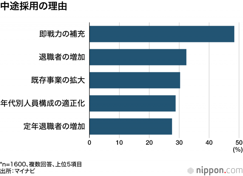 企業が中途採用を実施した理由を複数回答で尋ねたところ、「即戦力の補充」に続いて、「退職者の増加」32.4%、「既存事業の拡大」30.3%などが挙がった。