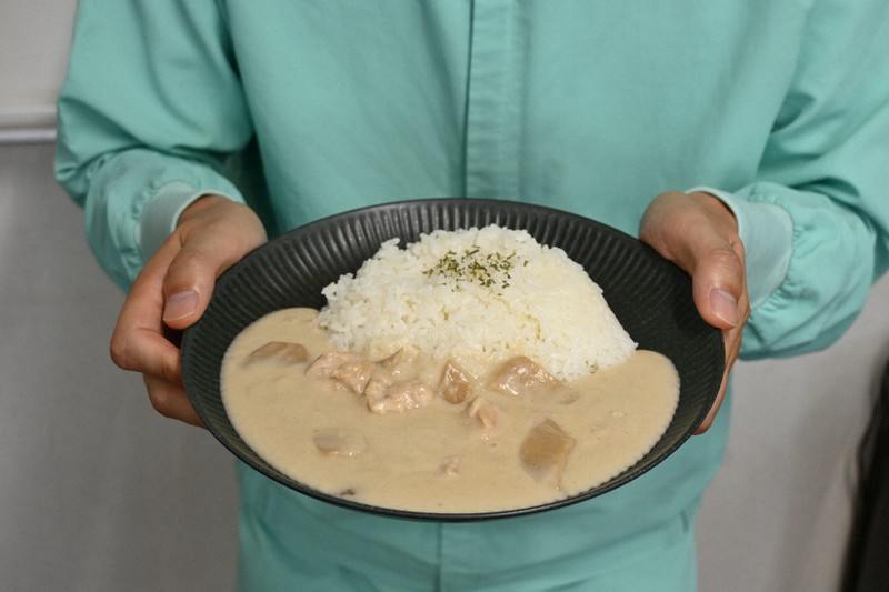 白いカレーの見た目はシチューのようだが、食べるとスパイスの風味が口いっぱいに広がる。口内の着色だけでなく、服に付いても気になりにくいという。外山さんは「白くておいしく、物珍しさがある。多くの方に手に取ってもらえたらうれしい」と話している。【荒木映美】