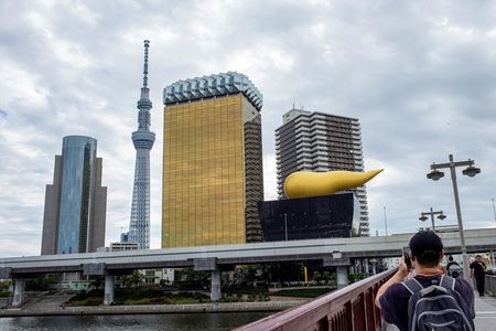 アサヒグループホールディングス本社(中央)=東京都内(AFP時事)