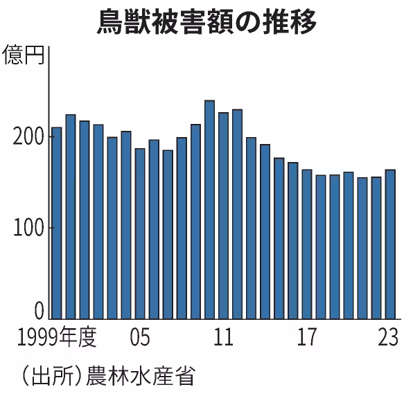 農林水産省によると、23年度の農作物被害は164億円で、22年度から8億円増えた。被害量は51万トンで、同4万トン増となった。長期的には減少傾向にあるものの、農業・畜産業の現場では高齢化が進んでおり、鳥獣害対策の省力化が課題となっている。