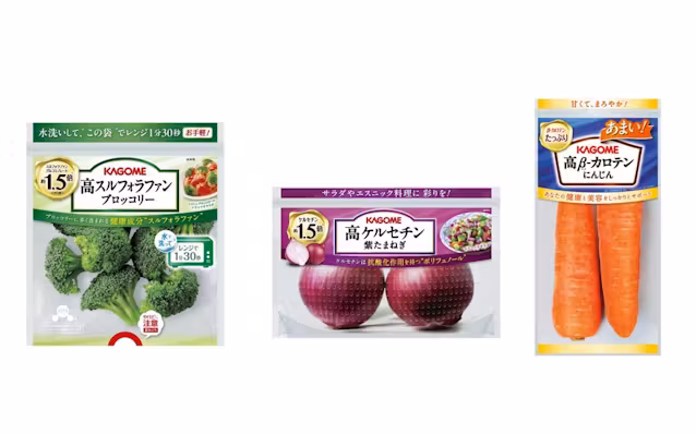 今回販売するのは「高スルフォラファンブロッコリー」「高ケルセチン紫たまねぎ」「高β-カロテンにんじん」。高スルフォラファンブロッコリーは、健康成分であるスルフォラファン含有量が一般的なブロッコリーよりも約1.5倍高く、レンジ加熱で簡単に調理できる。高ケルセチン紫たまねぎは、抗酸化作用を持つポリフェノールであるケルセチン含有量が一般的なたまねぎよりも約1.5倍高い。高β-カロテンにんじんは、一般的なにんじんよりも多くのβ-カロテンを含み、甘くてまろやかな味わいが特長という。