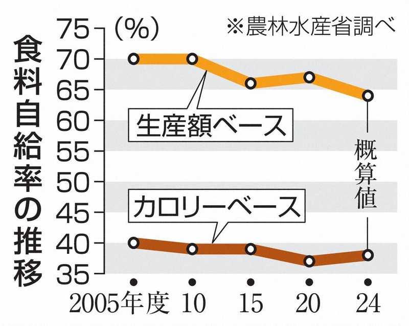 農林水産省は10日、2024年度のカロリーベースの食料自給率が4年連続で38%だったと発表した。政府は30年度に45%に引き上げる目標を掲げるが、向上していない。自民党の高市早苗新総裁はかねて自給率引き上げが必要だと訴えており、対応が注目される。生産額ベースの食料自給率は、コメ価格高騰などで3ポイント上昇し64%だった。