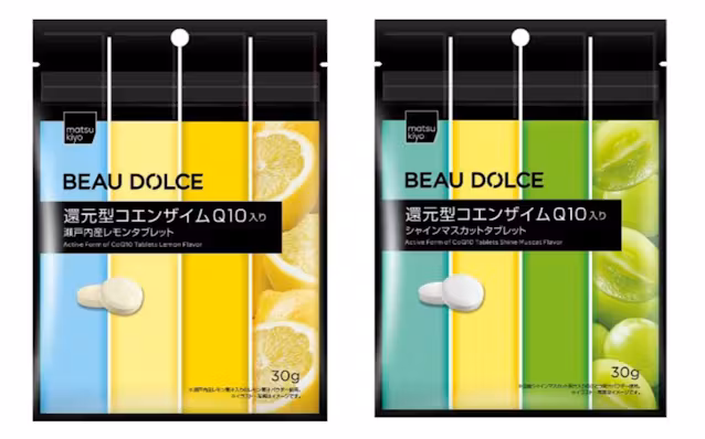 マツキヨココカラ&カンパニーは、美容おやつブランド「matsukiyo BEAU DOLCE」シリーズとして、「還元型コエンザイムQ10」を配合したタブレットを11日に発売すると発表した。全国のマツモトキヨシグループ、ココカラファイングループの店舗(一部店舗を除く)と自社の直販サイトで販売する。価格は税込み213円で容量は30グラム。