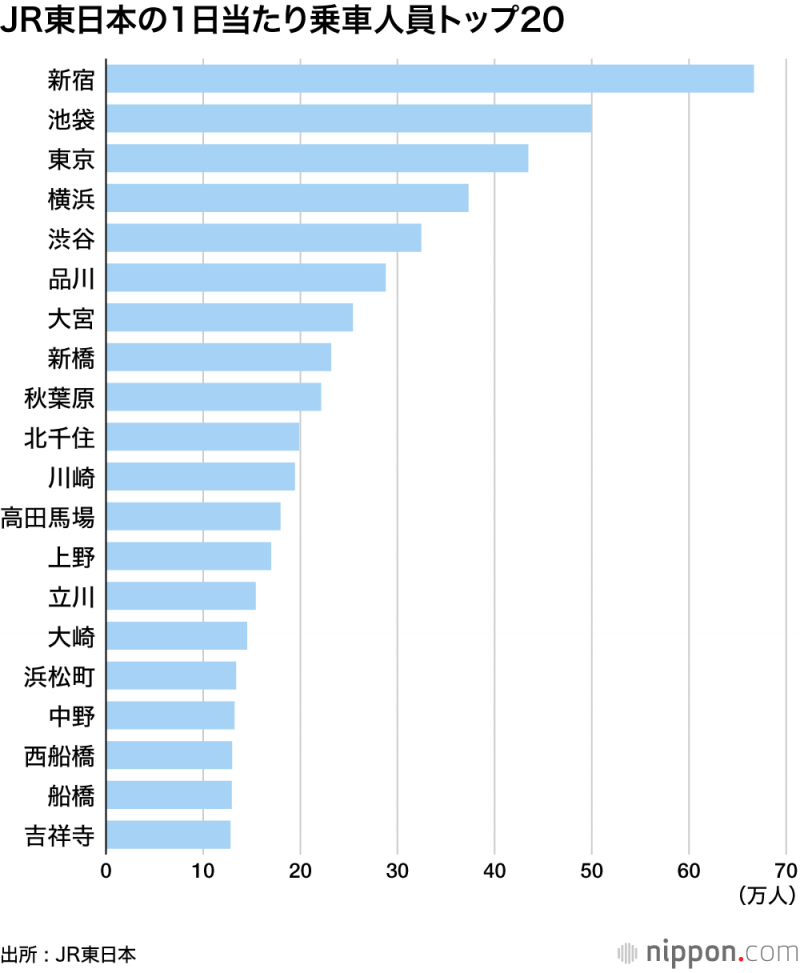 2位池袋の49万9128人(1.9%増)、3位東京43万4564人(7.6%増)。以下、横浜、渋谷、品川、大宮、新橋、秋葉原、北千住と続いた。トップ10の顔ぶれ・順位とも前年と同じ。上位100駅は軒並み前年度より乗車人員が増加した。