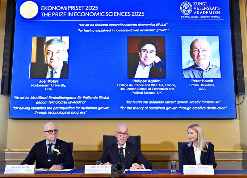 スウェーデンの王立科学アカデミーは13日、2025年のノーベル経済学賞を米ノースウエスタン大のジョエル・モキイア教授ら3人に授与すると発表した。授賞理由は「イノベーション(技術革新)による経済成長の解明」とした。