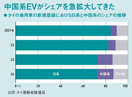 長年、日本車が9割近いシェアを誇ってきたタイ市場だが、近年は中国EV(電気自動車)の攻勢が激しい。中国EVのタイ市場での販売が本格化したのは23年のことだが、タイ運輸省陸運局によれば、同年の新車登録で前年から倍増の13.4%のシェアを獲得している。