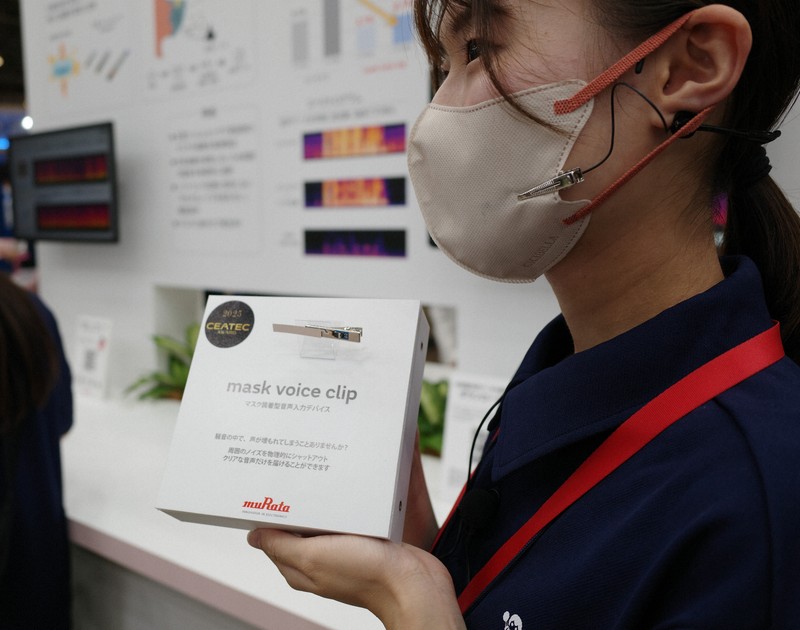 村田製作所は、今年の「CEATEC AWARD」で「デジタル大臣賞」を受賞した、マスクに装着する音声入力デバイスを展示。マスクの振動から音声を検出するため、周囲に騒音があっても話者の声を認識できる。担当者は「将来的には、ささやきや口パクでも音声入力を可能にしたい」と語った。