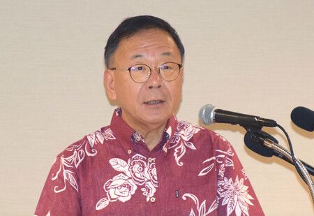 記者会見する日銀の田村直樹審議委員=16日午後、那覇市