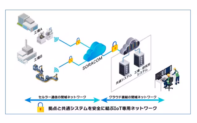 今回構築したIoT共通基盤は、同社の各工場内にある測定機器などのデバイスから、ソラコムの携帯回線による閉域ネットワークを経由して、クラウド上の共通システムや工場・研究所システムに接続する。