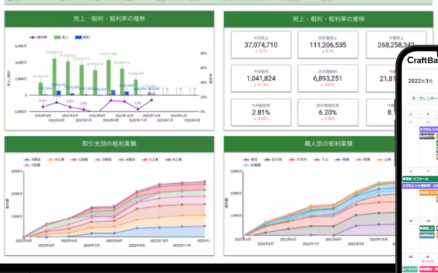 提供する経営管理システムの「クラフトバンクオフィス」は日報作成や勤怠入力といった建設現場の事務作業を対話アプリ「LINE」上で簡単にできる。国土交通省が許可を出す建設業の全29業種に対応し、利用者は1万4000人に達した。