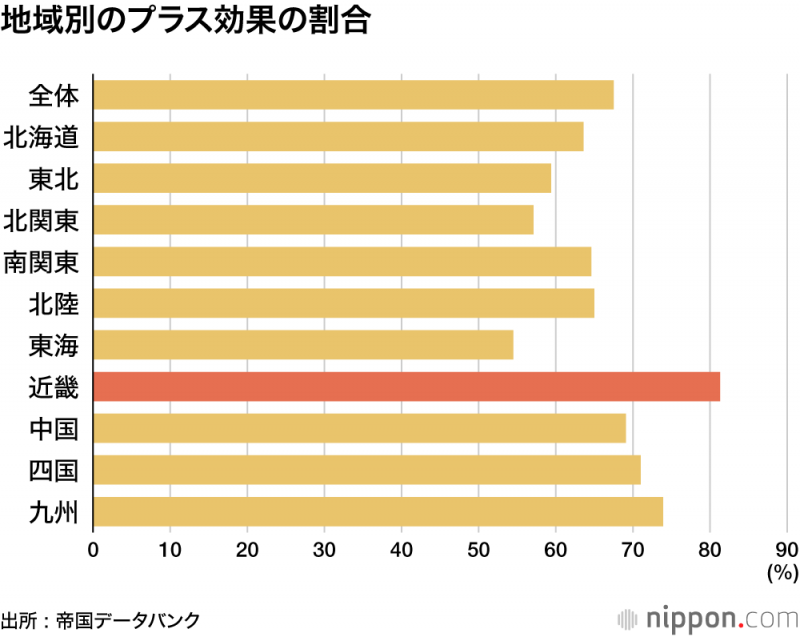 地域別にみると、「プラス効果」と回答した企業の割合は開催地の近畿(81.3%)が最も多い。以下、九州、四国、中国が続いており、西日本地域での評価が高かった。半面、「万博の影響でレジャー客の宿泊が減少」(埼玉県の旅館・ホテル)、「第2次産業には効果がなかった」(長野県の輸送用機械)などと、東日本では厳しい声も聞かれたという。