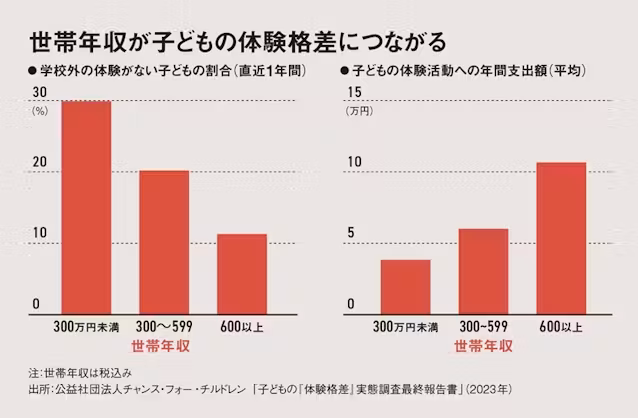 非正規雇用の拡大に伴って日本の経済格差は広がってきた。所得が中央値の半分未満に位置する人の割合を指す相対的貧困率は、主要7カ国(G7)の中で米国の次に高い。所得の格差は教育格差にもつながる。下のグラフにあるように、世帯年収によってスポーツや文化などの体験の豊かさや、大学進学率は顕著に差がついている。