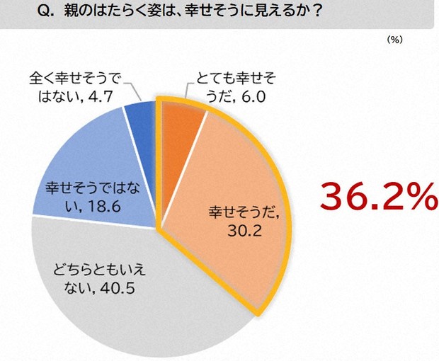 学生に「親の働く姿は幸せそうに見えるか」と尋ねたところ、「とても幸せそうだ」「幸せそうだ」と答えたのは計36・2%で、「全く幸せそうではない」「幸せそうではない」と回答したのは計23・3%だった。