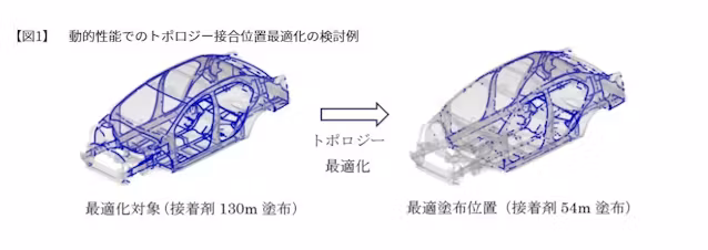 採用されたのは同社の「JFEトポロジー最適化技術」。車体部品の質量を慣性力として考慮し、最小の接着剤使用量で最大の性能向上を実現する。車内空間が広く開口部が大きい大型MPVで操縦安定性や乗り心地を向上しつつ車体剛性を確保するため、スポット溶接と併せて構造用接着剤による接合位置を最適化するのに同技術が使われた。
