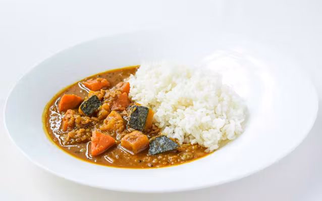 スズキ食堂はベジタリアン(菜食主義者)でも食べられるよう野菜や豆類を多く使うのが特徴だ。新味は豆とカボチャをベースにした南インドの煮込み料理を再現した。パッケージにはスズキ初の電気自動車(EV)「eビターラ」を描いた。