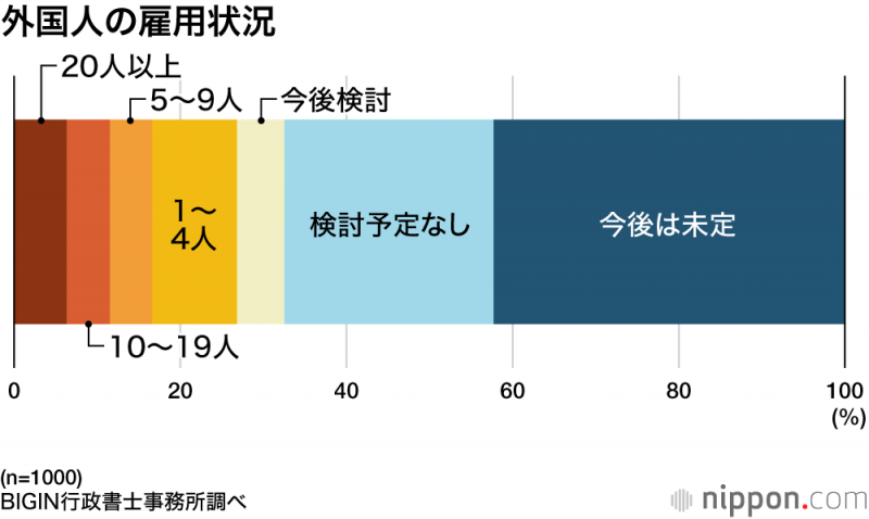 BIGIN行政書士事務所(東京都立川市)が全国の会社経営者・役員1000人を対象にアンケートを実施。現在、外国人従業員が「いる」と答えた企業は全体の26.8%で、「今後検討」を含めても32.5%にとどまった。「検討予定なし」「未定」が7割近い。