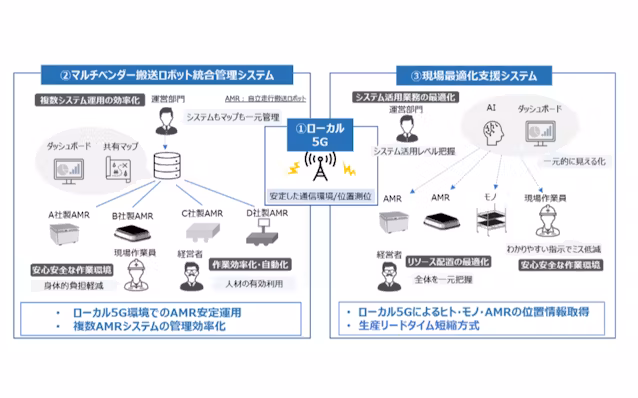NTT東日本とOKIは、複数メーカーの自律搬送ロボット(AMR)を統合管理する「マルチベンダー搬送ロボット統合管理システム」などによる生産体制の実証実験を11月4日から始めると発表した。同システムと、特定区域での高速通信規格「ローカル5G」よる位置測位データを活用し、人・モノ・AMRの配置や作業工程の最適化を検証する。
