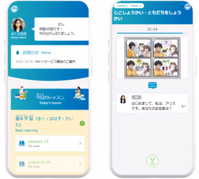 同社が開発したAI日本語学習アプリ「HAi-J (ハイジェイ)」では、日本語の発話練習やAIアバターとの会話練習ができる。会話内容は介護や飲食、ホテルなど外国人材の多い業界での顧客対応や、「報連相」といった日本のビジネスマナーを扱う。日常会話にも対応する。