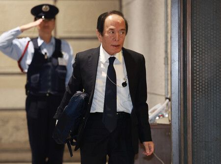 金融政策決定会合に出席するため、日銀本店に入る植田和男総裁=30日午前、東京都中央区