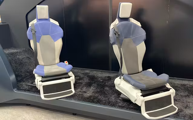 自動車部品大手ニッパツは30日、自動車ショー「ジャパンモビリティショー2025」で自動運転に適した自動車用シートを公開した。走行中にシートを回転させたりリクライニングさせたりすることを想定し、従来のシートより薄くすることによりシートを動かしやすくした。