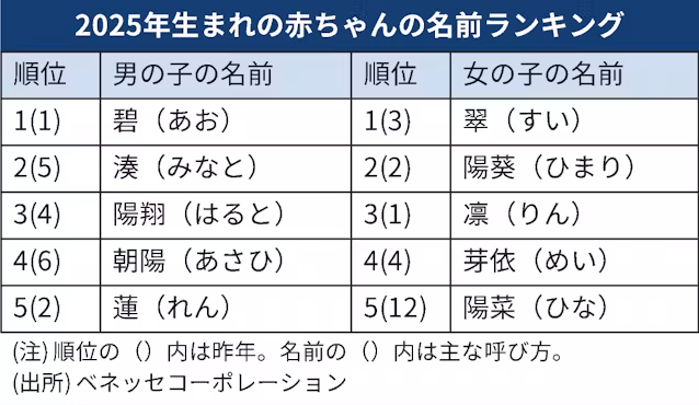 男子の2〜5位は「湊(みなと)」「陽翔(はると)」「朝陽(あさひ)」「蓮(れん)」だった。女子は「陽葵(ひまり)」「凛(りん)」「芽依(めい)」「陽菜(ひな)」と続いた。名前の読みはいずれも主な読み方。