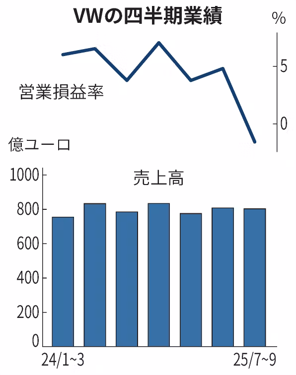 VWはポルシェの開発コスト増などで47億ユーロの減損損失を計上した。さらにトランプ米政権の関税政策の影響によって25年12月期通期で最大50億ユーロの追加コストが生じるとみている。7〜9月期の最終損益は4億8200万ユーロの赤字(前年同期は11億9300万ユーロの黒字)だった。