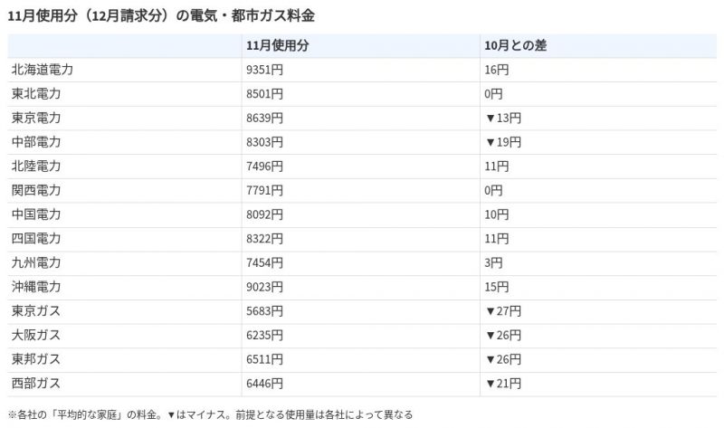 大手電力10社と大手都市ガス4社は30日、11月使用分(12月請求分)の電気・ガス料金を発表した。燃料価格がほぼ変わらなかったため、電気・ガス料金ともに前月から小幅な変化にとどまる。