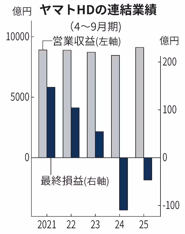 ヤマトホールディングス(HD)が30日発表した2025年4〜9月期の連結決算は最終損益が48億円の赤字(前年同期は111億円の赤字)だった。4〜9月期として2期連続の最終赤字だった。事前の市場予想平均(QUICKコンセンサス、5億8100万円の赤字)を下回った。値上げで人件費の上昇を補えなかった。