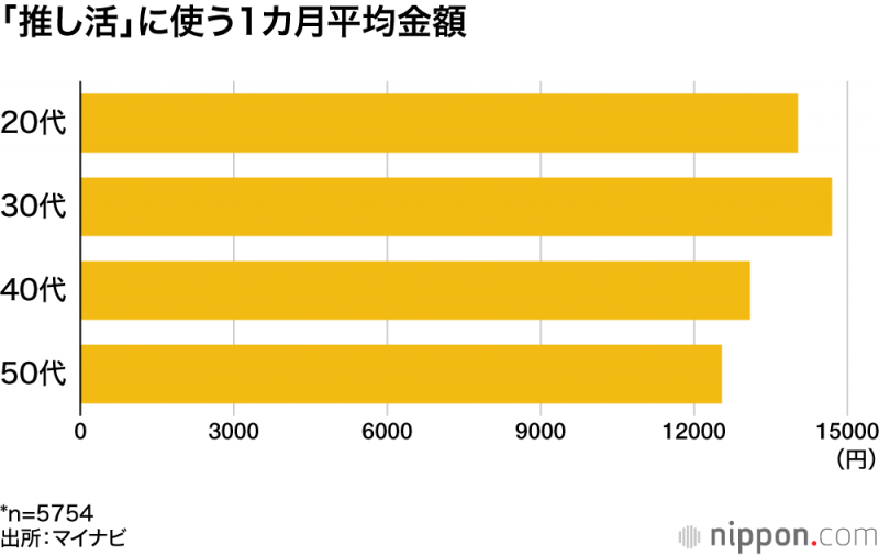 推し活をしていると答えた人に1カ月に使う金額を尋ねたところ、全体の平均は1万3305円だった。世代別では30代が1万4692円で最も多く、20代の1万4026円が続いた。