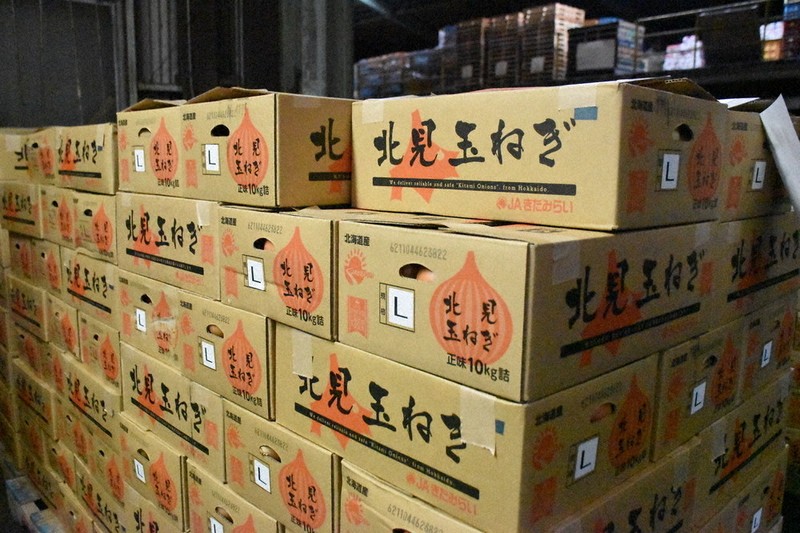 小林青果は北九州市内で約20店のスーパーマーケットに青果を卸しており、倉庫には出荷予定のLやMサイズのタマネギの箱が並ぶ。例年は店頭でL大サイズは3玉198円ほどで売られていたが、Lサイズに落ちても258円ほどの売値となる見込みだ。同社の末嶋美則専務は「4月ごろまでは高値が続くのではないか。消費者の皆さんには産地の状況を理解して購入していただきたい」と話した。