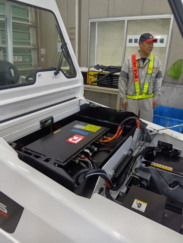 今回導入したトーイングトラクターは、ディーゼルエンジン車と同等のけん引力があり、容量48キロワット時の蓄電池を搭載する。満充電から3日程度使うと、残量が20%近くまで減るため、空港内の貨物上屋で夜間などに約6時間かけて普通充電するという。