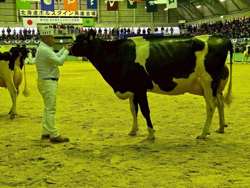 北海道安平町で10月25、26日に開かれた第16回全日本ホルスタイン共進会(日本ホルスタイン登録協会主催)で、千葉県鴨川市横尾の酪農家、糟谷英文さん(58)が出品した牛が、出産経験のある4歳クラスでトップの優等賞1席に選ばれた。