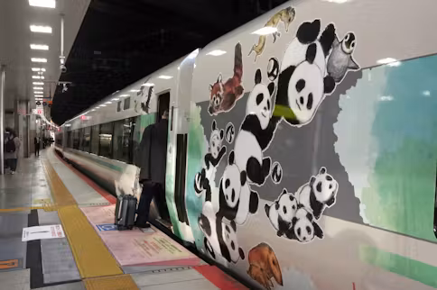 アドベンチャーワールドと共同企画した「パンダくろしお『Utopia Smile(ユートピアスマイル)トレイン』」は、天野さんがユートピア(理想郷)をイメージし、全6両の車体や車内にパンダなど様々な動物や擬人化されたキャラクターを描いた。11日午前7時に新大阪駅で出発式を開き、天野さんは「個性あるキャラクターたちが、列車として沿線の風景の一部となってくれれば」と期待を込めた。