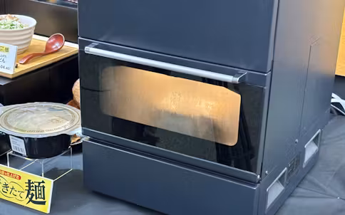 ソフトバンクロボティクスグループ(東京・港)が開発した調理マシンを取り入れる。まずマシンのスタートボタンを押すと、30秒かけて内部を洗浄する。その後、購入した商品を庫内にセットすると、高圧・高温の水蒸気で冷凍麺を急速に調理する。約90秒で温め終わり、操作開始から2分で熱々の麺とスープに仕上げる。