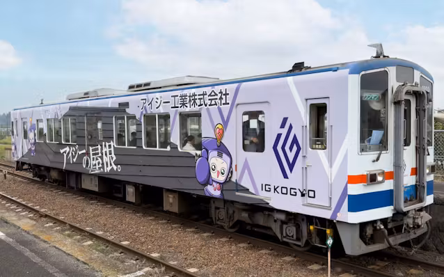 ディーゼルカー1両に公式キャラクター「めったるん」や企業名・ロゴ、「アイジーの屋根。」「まっすぐに、建物を包むチカラ。」といったキャッチコピーをあしらった。この「めったるんトレイン」が1日から下館駅(筑西市)と取手駅(取手市)の間を走っている。