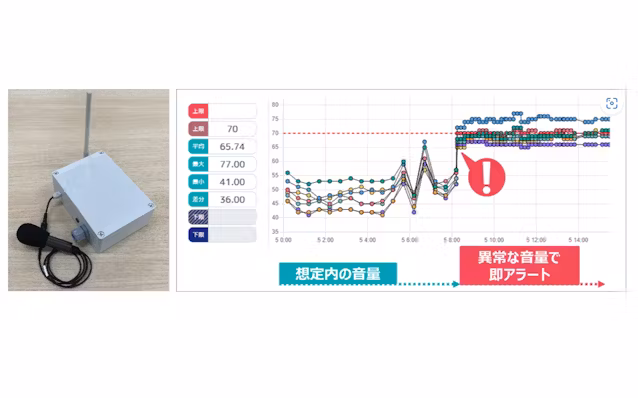 従来の収音センサーに発生音の常時監視機能を追加した。1時間おきの定期的な周波数帯ごとの発生音量の記録に加え、毎分発生音を計測して一定以上の音量が検知すると即時アラートを発報する。これにより近隣施設との騒音トラブルの防止や、現場における突発的な設備異常の検知がしやすくなる。