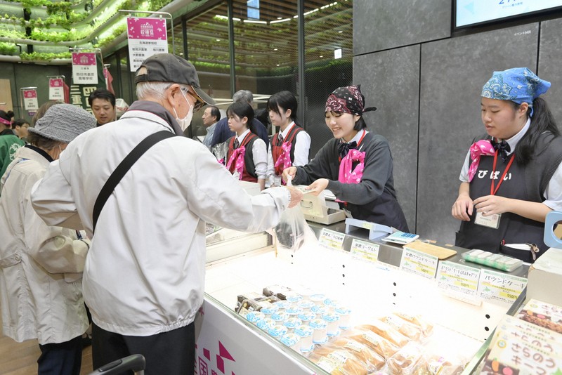 2会場のうち大丸東京店の催事場に出店したのは33校。10月に台風22号と23号が相次ぎ直撃し、大きな被害が出た伊豆諸島・八丈島の東京都立八丈高のブースでは、来場者から「大変でしたね」と励ましの声が次々とかけられた。東達康(みちよし)校長によると、生徒用玄関のドアが吹き飛んだり、下足箱がドミノ倒しになったり、経験したことのない被害が出たという。停電の影響で温度管理がうまくいかず、出品を断念した商品もあったが、店頭に並べたトマトケチャップ、いちごジャム、梅干しなどは次々と完売。木下和奏(わかな)さん(2年)は「『頑張ってください』と言って買ってくれる人がたくさんいて、元気づけられました」と語った。