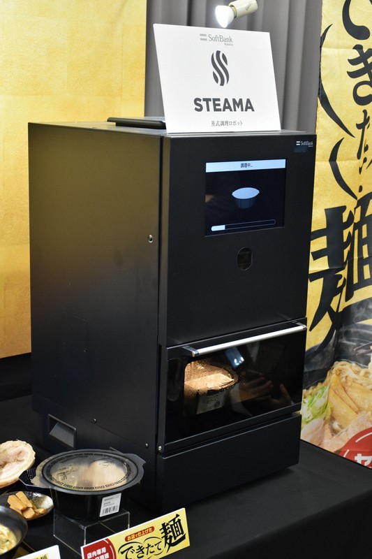 専用マシンは、ソフトバンクロボティクスが独自開発した調理ロボット「スチーマ」を採用。高圧・高温の水蒸気を用い、専用の冷凍食品を急速に調理する方法で、麺の中心までなめらかで弾力のある「ゆでたて食感」を再現した。