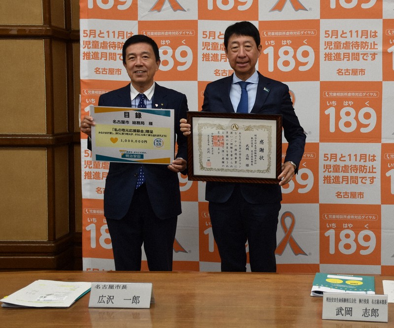 名古屋市の広沢一郎市長は10日、社員らから集まった募金計150万9078円を寄付した明治安田生命保険の武岡志郎・名古屋本部長に感謝状を贈呈した。