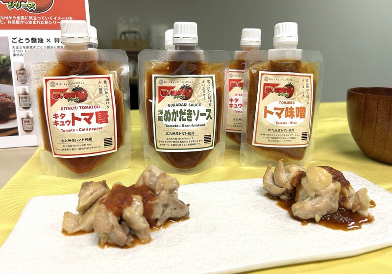「赤の輝き、食卓を彩る」をテーマに、トマトのうまみと唐辛子の辛みを融合した万能調味料「キタキュウトマ唐」▽郷土料理「ぬか炊き」をアレンジした「洋風ぬかだきソース」▽トマト出汁(だし)で煮込んだ「とまと出汁おでん」▽フリーズドライトマトを使った「とまとチーズ大福」――などのユニークな商品をそろえた。地元の老舗で知られる「ごとう醤油」(八幡東区)、「山吹」(小倉北区)、「なごし」(門司区)の3社と、井筒屋が3月に新設した地域商品開発担当が共同で手がけた。