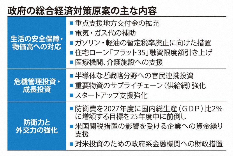原案では生活の安全保障・物価高への対応▽危機管理投資・成長投資による強い経済の実現▽防衛力と外交力の強化――を3本柱に据えた。