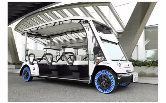 同社が所有する低速走行の電動車「グリーンスローモビリティー」を久留米市に貸し出し、AirFreeを装着して実証実験を行う。AirFreeは空気の代わりにリサイクル可能なスポーク形状の熱可塑性樹脂で荷重を支える。パンクの心配がなく、資源生産性が向上してメンテナンスを効率化できるという。