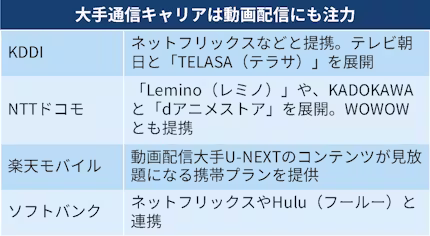 動画配信も混戦模様だ。KDDIはネトフリの視聴をセットにした料金プラン提供を業界でもいち早く始めていた。楽天モバイルは10月、動画配信大手U-NEXTのコンテンツが見放題になる新たなプランを始めた。ドコモは衛星放送のWOWOWとの提携を発表したばかりでコンテンツ重視の姿勢が鮮明だ。