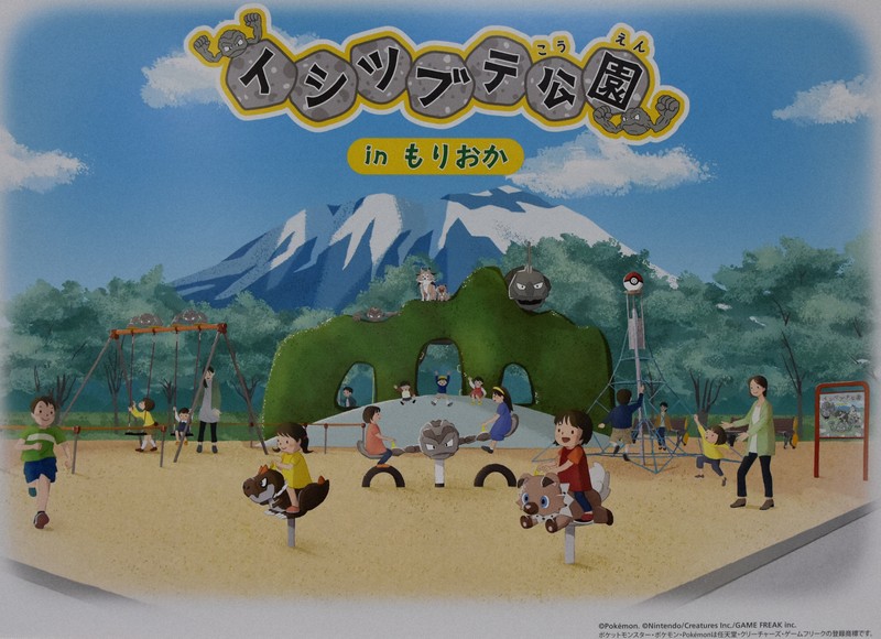 中央公園には、イシツブテの両腕に乗れるシーソー、ブランコ、ロッククライミングのように登れる遊具の他、ピカチュウのベンチなどが設置される。ポケモンの遊具は、これまでに県内の久慈市と北上市にも贈られた。