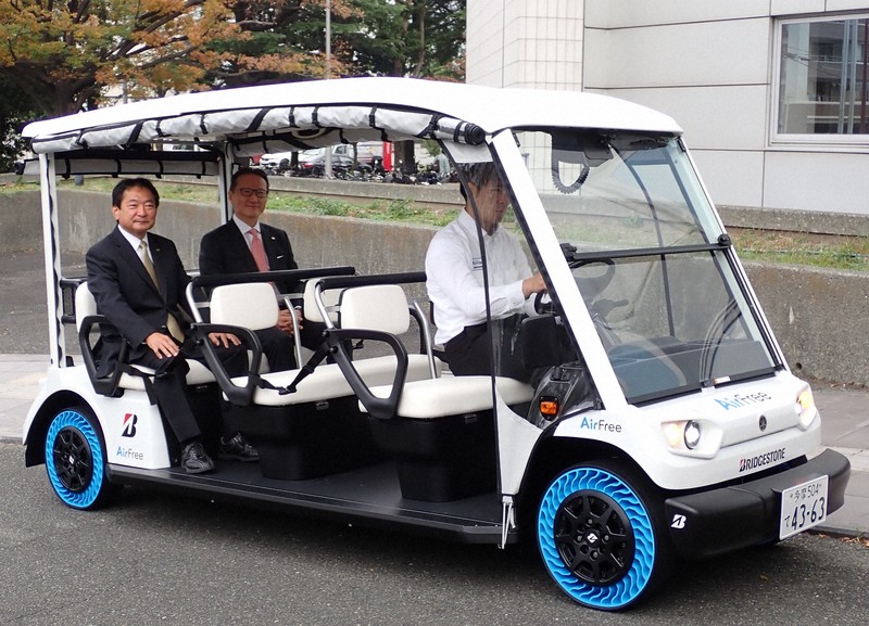 協定締結後に、市役所前の車回しで田村亘之ブリヂストン副社長とエアフリーを着けたカートに試乗した原口新五市長は「非常にスムーズだった」と話した。【前田博之】
