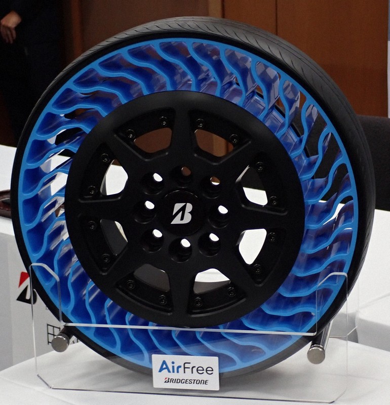 エアフリーは接地面はゴムだが、内側はスポーク状の樹脂板で弾力性を持たせる構造。空気不要でパンクせず、ゴムは張り替えられ、樹脂はリサイクルできるなどサステナビリティを重視した。樹脂の色は暗い所で見やすい青色。