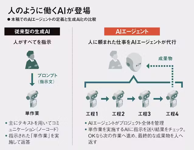 一方のAIエージェントは、人の指示を受けずとも、複数の工程が必要な作業に対応できる。人でなければ手掛けられなかった、複雑な作業を代行できるわけだ。司令塔となるAIが、一つ一つの作業を実行するAIに指示を与え、監視し、出してきた回答が正しいかどうかの判断までして次の工程へ進む。人に成果物を届けるのは、最後の工程まで終わってから。仕事を与えるのは人だが、その後はAIが「自律的」に仕事を進めるのが特徴だ。