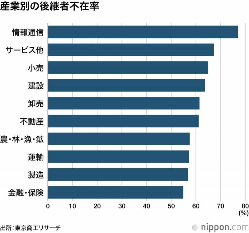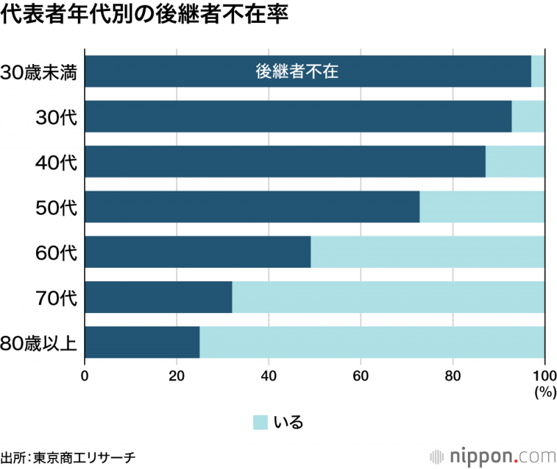 代表者の年齢別でみると、40代までは不在率80%超だが、創業や事業継承からの経過年数が短く、選定の必要に迫られていないためと考えられる。勤め人であれば定年を迎える60代でも49%、70代32%、80歳以上25%は次の社長が決まっていない。東京商工リサーチでは「円滑な事業継承には数年が必要で、高齢の代表者に後継者が不在の場合は、いずれ事業をたたむことになる」としている。